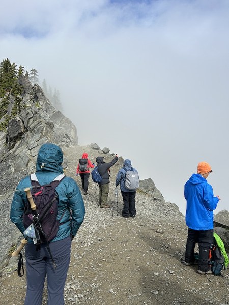 Any hike leader is weary of a forecast that calls for thunderstorms, especially on this trail due to the many exposed and ridge line hiking. We were all mindful of this potential threat and were open to altering our plan if needed. As the rain became heavier, we dawned our raingear and ate a quick lunch in some tree cover before continuing on to the Katwalk. Fortunately the thunderstorms held off and we were welcomed with over two hours of sunshine!!! As we made it to the Kendall Katwalk, the sunshine really opened up and provided more views than anticipated.