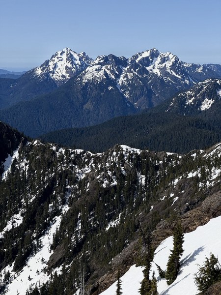 Out of the burn and onto the snow the views opened up with Washington, Ellinor, the Hood Canal, Rainier, Adams, and St Helens all making appearances.