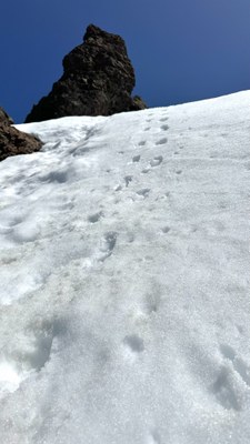 We chose the wrong gulley initially and knew it was because the scramble to the summit would have been class 4. We backtracked and then found the right gulley. You can see our tracks going up to it in the photo below.