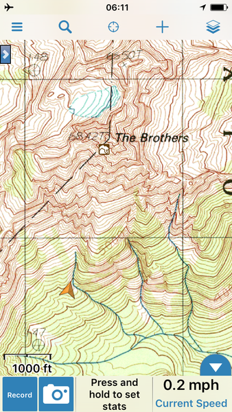 We woke up early July 15- 3:30am- and were on the trail by 4:15am. We hiked in the dark and quickly came to a downed bridge, which required straddling and crawling across, but other than being awkward, was fine. We hiked about another ~1mile up along the right side of the creek following the path across washouts and along the hill side- fairly straightforward, again, being mindful- and got to the creek crossing (shallow, easy to hop on rocks) at a higher campsite by 5am. Crossed over to the left side of the creek, and went up through the first confusing area but easy to follow flagging tape if careful up along the right side of the creek coming down from the South Brother. The trail becomes more obvious after this- don't be tempted like my partner to go down and cross the main creek though. There's ample flagging tape up there- just look out for it. You then emerge into a clearing and then follow flagging tape through low-lying (8' or less) trees and shrubs up the valley to the upper burn area, with many dead white snags, red dirt, and downed trees. It's a bit of a mess but following the red dirt path up a steep gully worked best and avoids having to climb over dry and charred dead tree piles. A small snowfield over a creek leads to a dry area around 4400' (see Gaia snapshot photo)