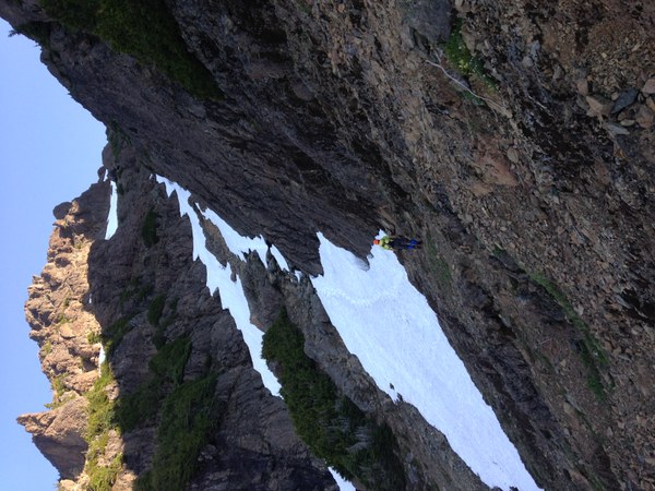 This involved crossing snow, then climbing scree in the middle, then more snow that progressively got steeper as we went up. The "hourglass" I guess is now a steep and narrow snowbridge which will likely melt out soon enough and be quite sketchy. We had relatively firm snow in the morning that allowed for kicking steps, and the gully didn't get sun until we were on our way down around 9 or 10am. At the top of the snow (hugged wall on the left side going up the snow in the photo to reach top of snow):