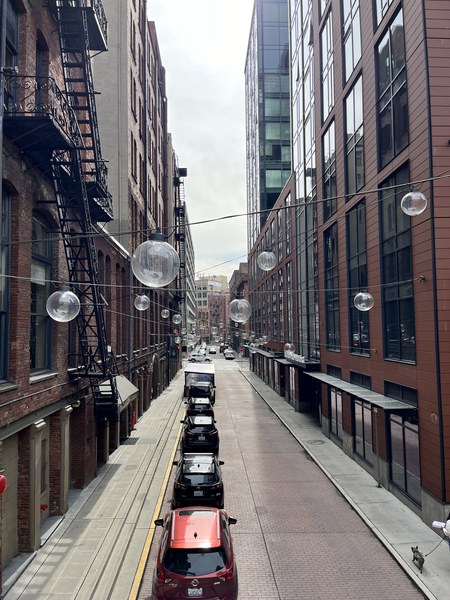 From Pioneer Square Habitat Beach (new park!), head up a flight of stairs to skybridge to cross Alaskan Way. Glide up post alley for a little warm up, past the gumwall and through Pike Place Market. We had a run-in with a tiktok comedy star who was visiting town. Continue north past Victor Steinbrueck Park, Belltown neighborhood, and Olympic Sculpture Garden.