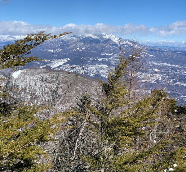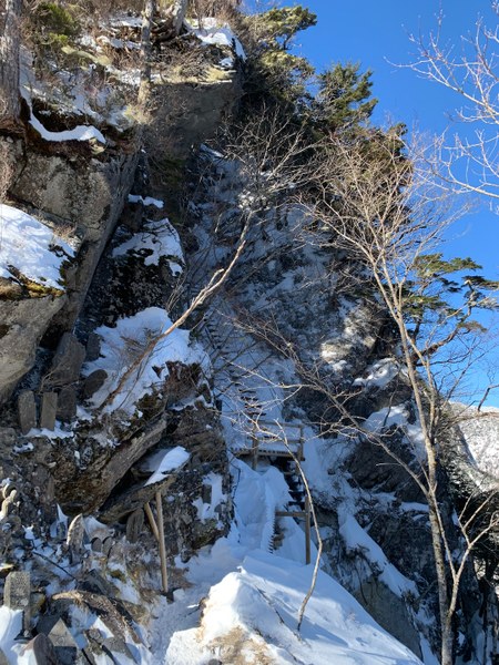 I continued up the stairs, which were not secure in the snow and ice, often times there wasn't much to hook an axe pick or crampon point on or in. After hitting 10:15am I turned around and started back down. The going was much easier in the track that I had plowed out, so after 7.5 hours ascent I made it back to the car in a bit under 4 hours. The Yatsugatake range was visible with great clarity from the open sections of the ridge, and it was an otherwise straightforward descent to the parking lot.
