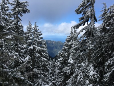 Rain in the morning (as forecast) but changed to snow at ~3000' and the day only got better from there on (intermittent sun breaks and snow flurries). Used snowshoes most of the day, but snow was surprisingly firm which allowed us to make great time.
