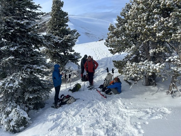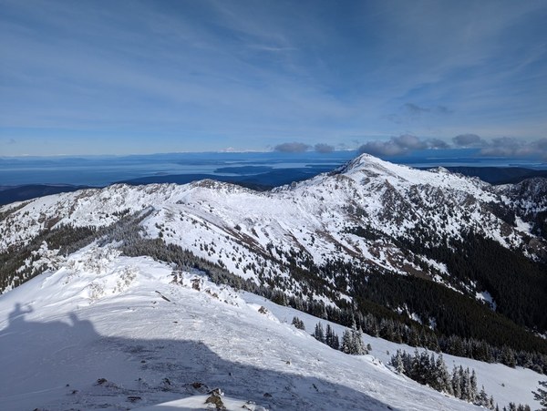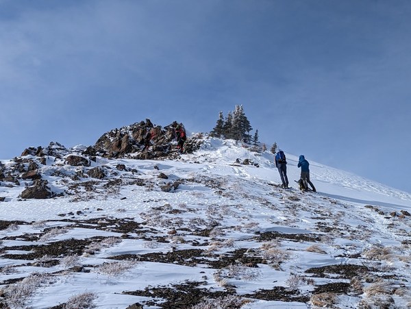The creek crossing near the TH was a little more exciting than normal with the higher water level, but everyone kept their feet dry. First snow was at 4,000 ft and by 5,000 ft snowshoes made travel easier. We took the ridge all the way to the false summit and avoided the summer route that goes to climbers right under the avalanche slope below the false summit. Wind was 40-50 mph past the small tree grove of the false summit to the summit. There was no wind below the false summit and a mile of high wind gave it an adventurous feel. The traverse to Tyler looked pretty scoured and avalanche safe. Photos from Tanna Knouse