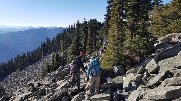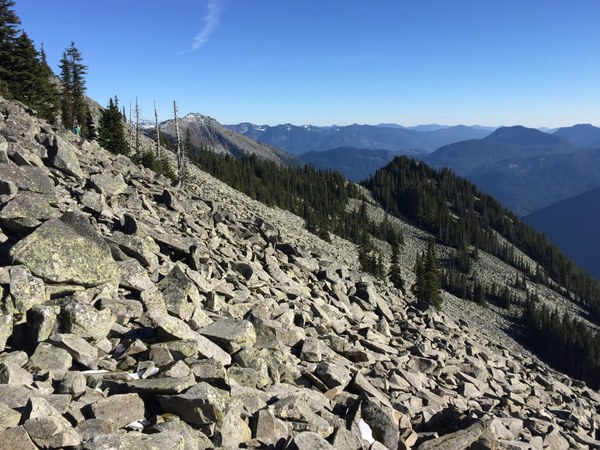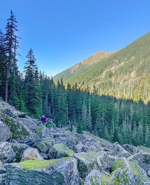 We took turns leading. Each person had time with some easy navigation as a trail or bootpath was almost always evident. Before arriving below Mason Lake, we came across this boulderfield. Cairns guided us across where we picked up the trail/bootpath again. Luckily the boulders were dry although mossy. We probably could have dropped below the boulders to cross, but this wasn't much of a problem today. Photo courtesy of Claire G.