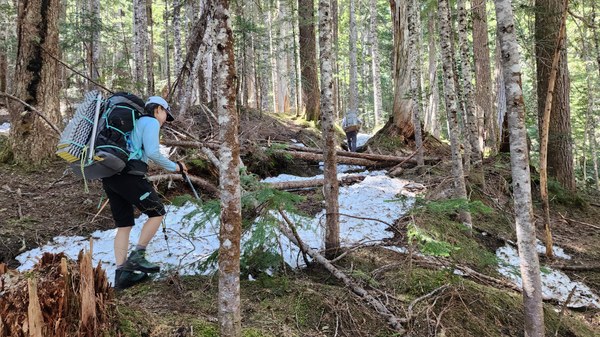 About 2.5miles in (3250') we encounter our first patches of snow. It's a while before it becomes consistent and occasionally we're walking what feels like a rocky stream bed due to the snow melt, but it's never a problem.