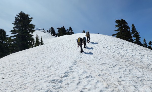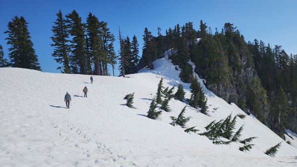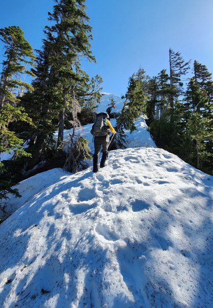 At about 4300' we break out of the trees for our first views. The snow is consistent and definitely softer than in the trees, but no snowshoes are needed.