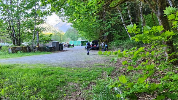 The Cow Heaven trail begins just past the Marblemount Ranger Station. We had plans to stop there to talk to a ranger, but it was closed which was surprising for a Saturday at 10:40am. Thankfully the restroom was open so we took advantage of that before driving the few minutes to the trailhead. The parking area is pretty small, for about 4-5 cars. Photo of the parking area taken on our return.