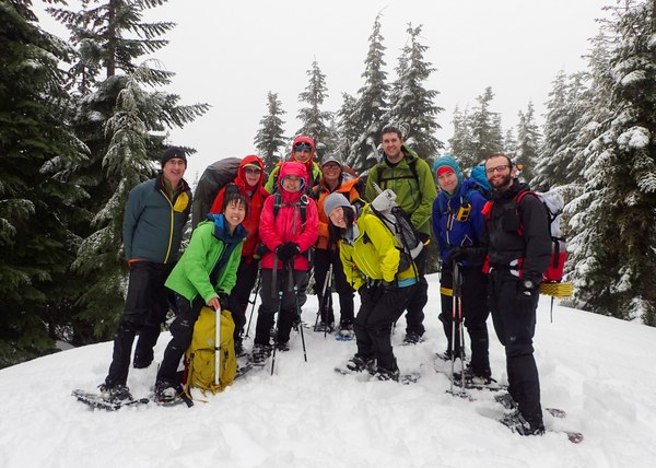 Our trip began early so that a few could have time to shower and change into their best non-mountaineering outfits in time for the Mountaineers Gala in the evening. We left the New Si Trailhead at 7:10, carrying snowshoes, helmets, ice axes, and two rounds of summit treats. We turned east after .7 miles towards Teneriffe on the Spring Trail. (I am not 100% sure of the name as it is a newer trail and not on most maps. It can be seen on this map below the Talus Loop Trail and above the Roaring Creek trail. https://www.dnr.wa.gov/geo/mountsi.pdf) We then ascended on the Mount Teneriffe Trail, donned snowshoes at about 3700 feet and, breaking trail in less than a foot of snow, scrambled to Blowdown, arriving at 10:30. On our first summit we enjoyed fresh snow, fluffy snowflakes, and respite from the rain.