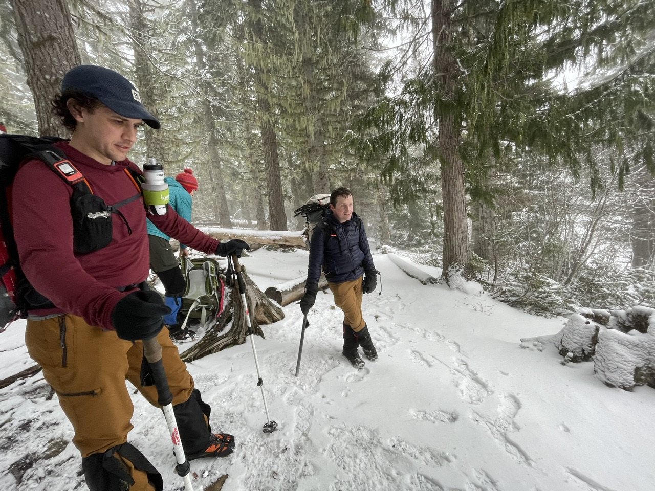 The Lake Dawn Trailhead (elevation ~1,850’) was snow free with shallow snow encountered at ~4,000’ where we transitioned to micro-spikes. After leaving the trail at ~4,500’, we changed to snowshoes at ~5,000’ for the final 500’ to the summit of First Top (elevation ~5,500). After descending to ~3,150’ our 2nd cross country segment to the Lake Angeles Trail at ~2,600’ was entirely snow free. While ascending the Lake Angeles Trail we donned micro-spikes at ~3600’ to reach Lake Angeles, then cross country to the summit of Point 4795 (the last 100 yards was definitely snowshoe terrain but we toughed it out to save time).