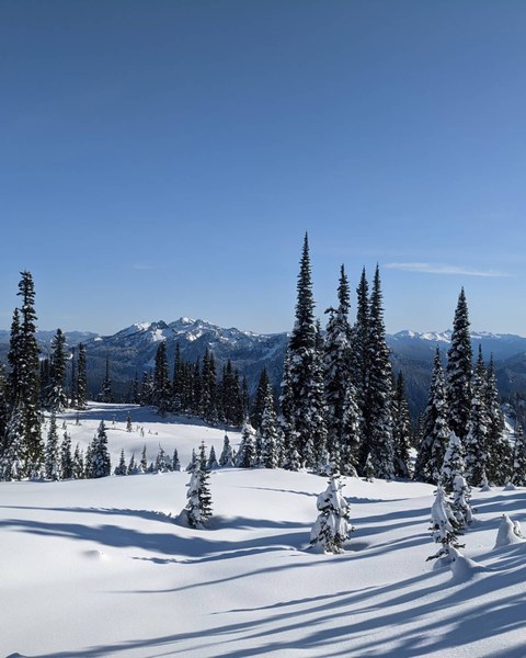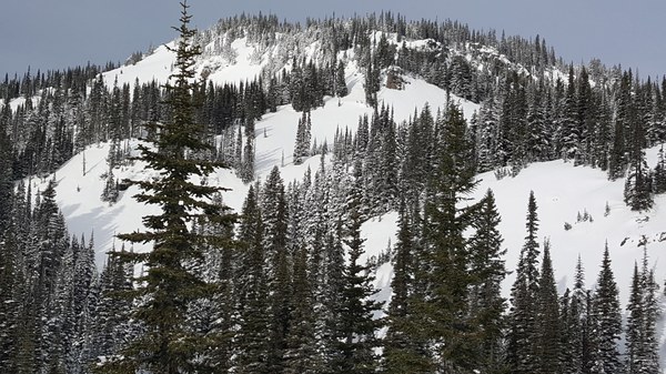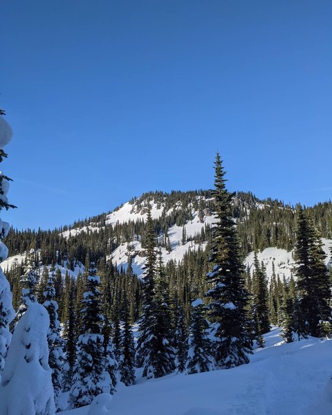 Looking back at the summit - once back in the trail and trees. We ascended to the left of the picture in the open slope - sticking close to the trees to avoid any avy danger