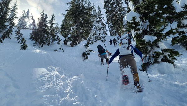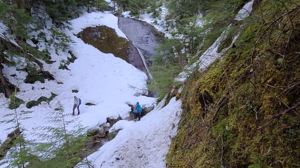 Around 2200' we hit consistent snow, but because it's pretty consolidated, we avoid putting on snowshoes.