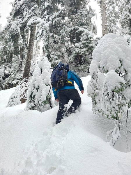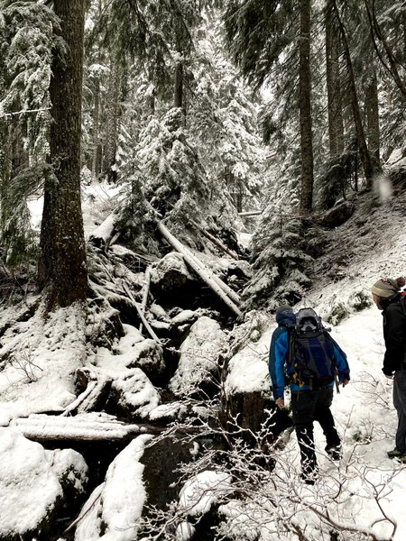 Our party made good progress with no major issue to the Horse camp besides the rain falling on us. By this point the rain was no where near as bad as forecast and we had yet to see or hear any wind for the day. At the Horse camp we took a short break and then headed left up the steeper route to the top of Rose. Just after Horse camp we encountered the first trace of snow at around 3,000 feet. This snow appeared to be fresh snow that had fallen over night which was slightly unexpected given that the weather report predicted no snow accumulation for the last few days.