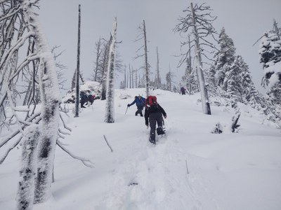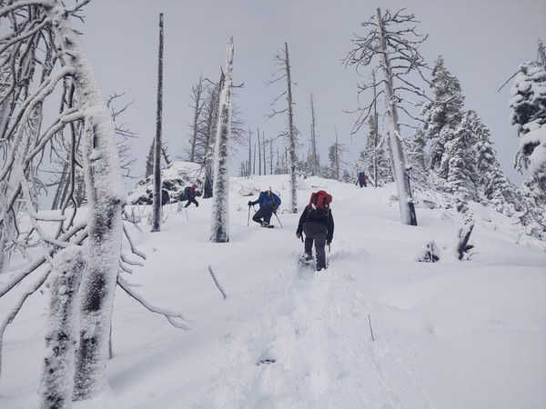The trail to horse camp was snow free. The snow line started soon after horse camp at around 3,000 feet. Travel to around 3,800 feet was possible without snow shoes. At around 3,800 feet our party elected to put snowshoes on due to fresh snow accumulations and post holing issues.