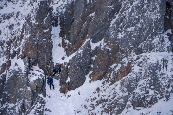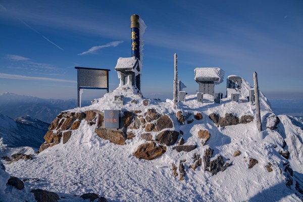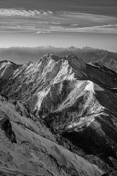 Above heading up past the chains is the SW face of Mt. Akadake, the route generally follows the shallow gully, where it is a good idea to get through and then down it before the sun starts to loosen up the rocks above. From there, it was a short and fun mixed scramble to the summit. Never terribly exposed, but with good views. Steep, but I never felt the need to get out my second axe, good footwork with 1 axe was sufficient. There were a couple small rock steps to gain the summit, which were a nice touch to finish the climb. I took a few pictures from the summit, explored the ridgeline a bit, where there was another shuttered mountain hut. After a snack, I descended the climbing route. The bigger range, Southern Minami Alps can be seen in the distance beyond the Yatsugatake range ridge in the foreground.