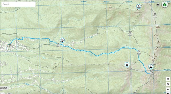 Mt. Akadake is a 9,512ft peak, normally climbed either from the north ridge, which forms the spine of the Yatsugatake range; or from the southwest face coming up from the Amida-Aka col. The picture of the southwest face looked more exciting, with some definite mixed scrambling without being terribly comitting, so I decided that would be the route. The climb is usually a half-day trip, but my compact rental car didn't have chains, 4WD, or winter tires so I started where the road started to get too dicey, adding some distance (blue line vs. trailhead icon) making it a round trip of about 11 map-miles and 5,050ft of elevation gain.