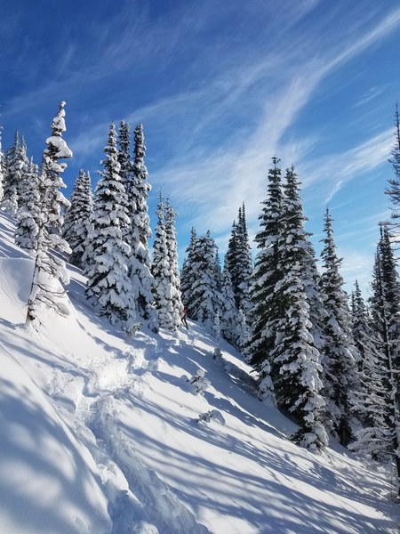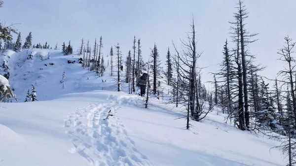 About 50' down the broken trail ends. Those who kept their snowshoes now put them on while the rest trudge on without them. Luckily it's not too bad for those without snowshoes since there is a consolidated layer below 4-6" of newer snow.