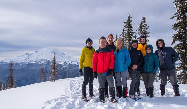 We've been following broken trail so far and they continue on to Mutton. No snowshoes have been needed so some decide to leave theirs here. We need to drop about 200' and then gain the ridge to the summit. Off we go.