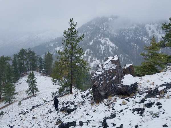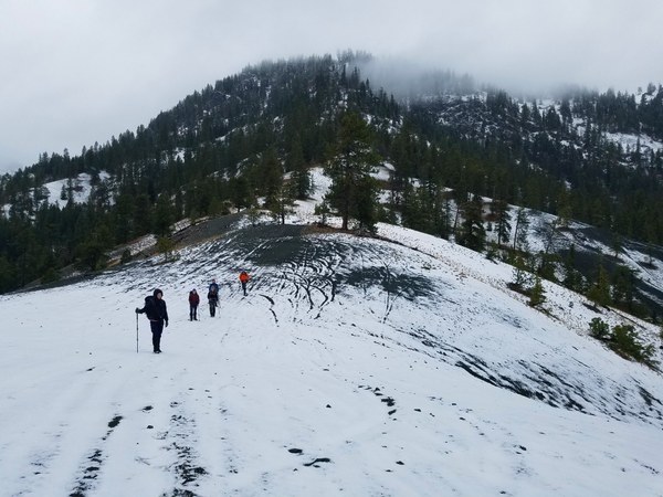 The breeze continue, there are few views and it's still snowing by the time we arrive at the saddle. We decide to call it an early day and head back. We take a shortcut going down a sandy gully that's easy to plunge step and save ourselves about a mile of road walking.