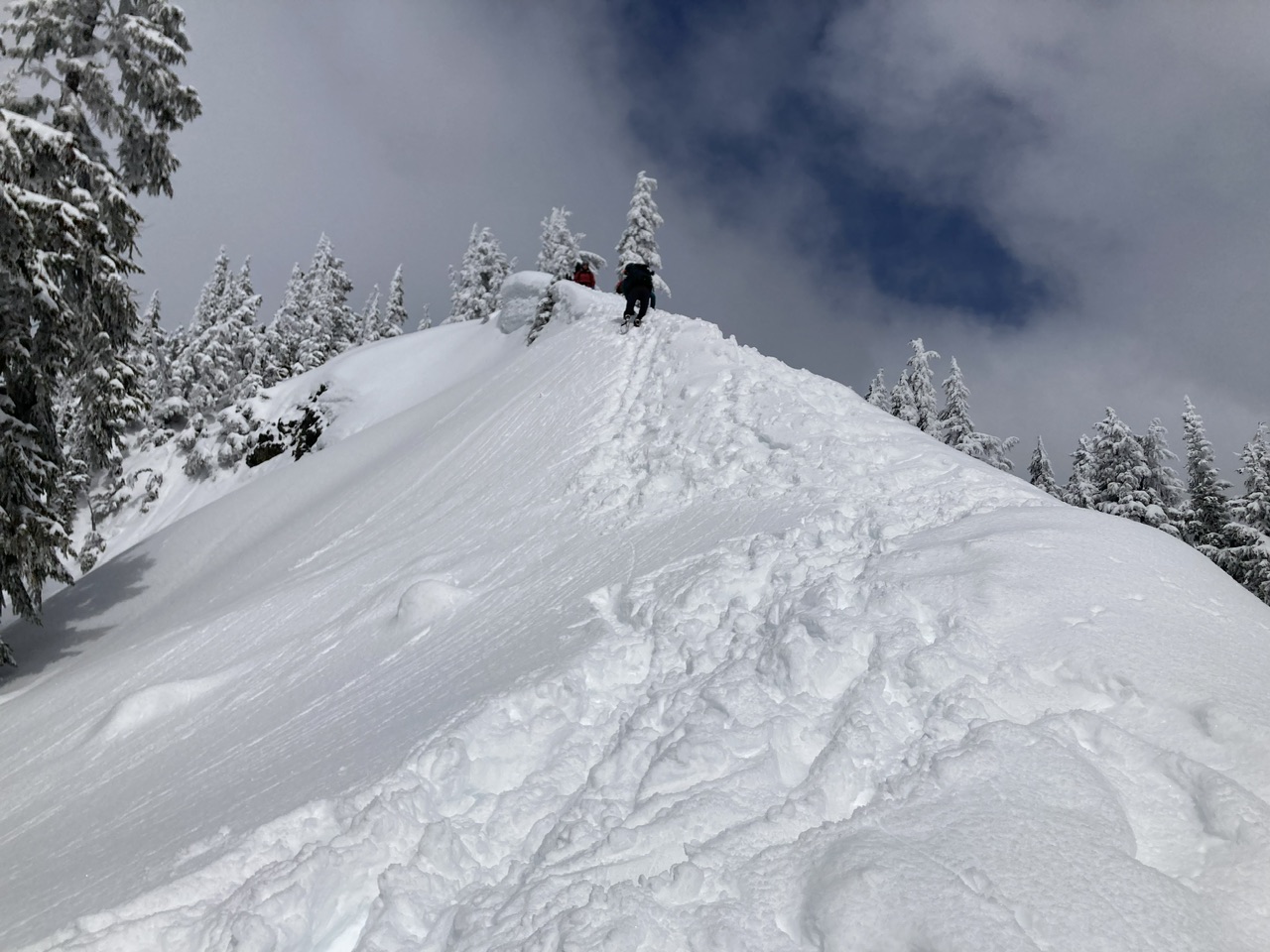 As it turned out the west side of the constriction actually had some nice step kicking and ice-axe self-belay snow conditions. Seemed more secure than the crest, especially when able to rely on a solid self-belay above when kicking the steps.