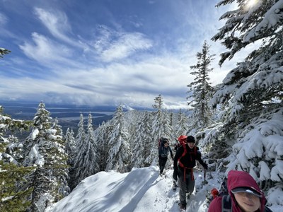 With recent exuberant weather (i.e. lots of fresh snow) plus cold temperatures complicating access at higher altitudes (i.e. driving on compact snow/ice) a rain shadow venue with a low altitude start seemed in order. South Green Mountain via Notch Pass (from the Penny Creek trailhead, elevation 700’) fit the bill, and only an hours drive from the ferry terminal. In spite of great views and beautiful rain shadow weather conditions, I would only give this one 3 stars due to the excessive rhododendron brush bashing. Then again, if you were really after learning how to brush bash it would be a 5 star venue.