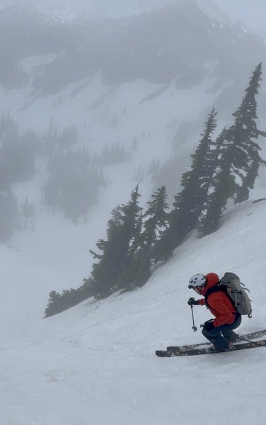 Snow coverage is excellent, and moderate temperatures and cloudy skies kept the soft snow skinning and skiing well into the afternoon. There were sun cups, runnels, and some residual wet-loose debris, all of which was soft and didn't present an obstacle for skiing. Tree wells and some glide cracks are present and widening.
