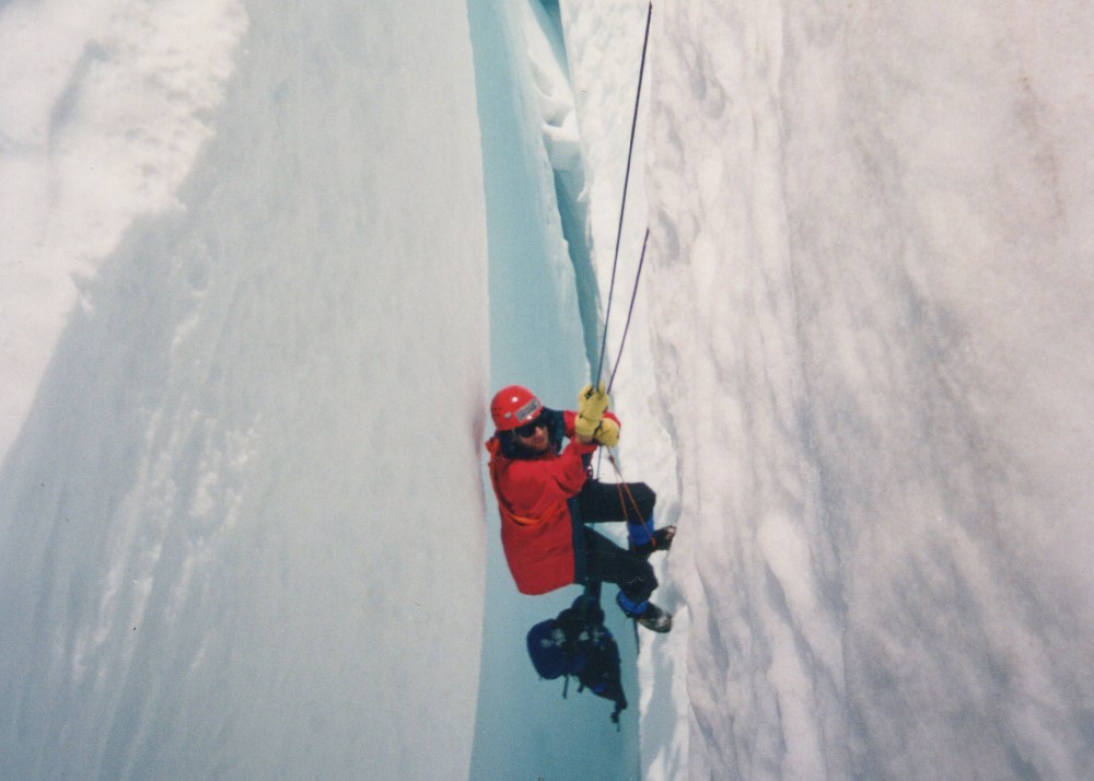 It was during my Basic Climbing Course crevasse rescue training on Mt. Rainier. Before I was lowered into a huge crevasse, I asked one of the instructor assistants if he could snap a photo of me in it. He seemed thrilled to do it, and I handed him my disposable film camera. When I was deep in the crevasse he yelled my name. I looked up to see that he had swung out over the crevasse (he was roped and secure) and started snapping photos of me as I prusiked to the top.