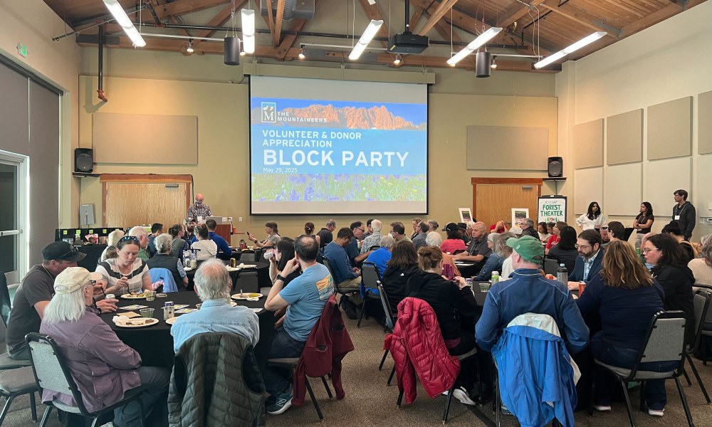 This annual appreciation event celebrates the role and impact of Mountaineers donors, Super Volunteers, Key Leaders, and Key Instructors. Thanks to the dedication of our volunteers, we are able to advance our mission of helping people confidently enjoy the outdoors, find belonging outside, and conserve the natural world for generations to come. Volunteers lead almost every aspect of our programming, from leading trips to writing for Mountaineer magazine to teaching courses to cooking family-style meals at our lodges.