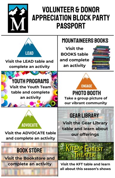 The Mountaineers® is a 501(c)(3) organization supported through earned revenue and elevated through charitable contributions. Our staff work to support our seven branches (Bellingham, Everett, Foothills, Kitsap, Olympia, Seattle, and Tacoma), three lodges (Baker, Meany, and Stevens), and our Kitsap Forest Theater. Tax ID: 27-3009280. 7700 Sand Point Way NE, Seattle, WA 98115.