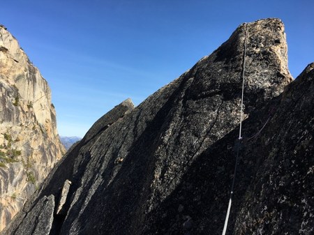After the belayer felt his rope leader’s fall to stop, he pulled rope through his belay device while moving upward to the crest of the shark fin. The belayer called to his fallen rope leader (now will be called the injured climber) to ask if he was okay. The injured climber replied that he had broken his wrist.