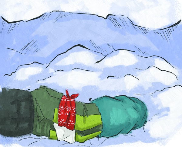 In 2020, Sue Shih, Drew Eliott, Rochelle Garcia, and I set off on a scramble of Kimtah and Cosho Peaks via Easy Pass in the North Cascades. The plan was to ascend a gully to Ragged Ridge, traverse east to Kimtah, come back and traverse to Cosho, and descend. In case we didn’t return to camp before dark, we each packed a sleeping bag and overnight gear for a possible bivy. We reached a notch 900 vertical feet below the ridge crest between Cosho and Kimtah. Thinking we’d surely get back this far before dark, most of us stashed our overnight gear. The scramble to the ridge and traverse to Kimtah took longer than expected. After summiting, we moved quickly toward Cosho, making it back to the saddle as it became dark. Our overnight gear was 900 feet of loose rock and scree below. We felt it would be better to sleep at the saddle than to descend by headlamp. I found a depression near the breezy ridge crest, emptied my pack, and put on all my layers. My torso was passably comfortable, with a down puffy over a vest and a shirt. For my legs, I only had rain pants over hiking pants over boxers. For additional warmth, I put my legs in my pack. But my thighs were still exposed, proving too cold for sleep. I tied a bandana around one thigh, and a triangular bandage from my first aid kit around the other. I slept fitfully in 40-degree temps and woke to beautiful views of Mt. Logan across the valley. We made it back to our gear, and Sue and I scrambled up another gully to tag Cosho… But that’s a story for another day.