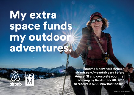 All those travelers will be looking for a place to stay so they can enjoy the beauty and wonder that is the Pacific Northwest, which makes right now a great time to earn extra money and connect with outdoors-minded guests by sharing your space on Airbnb. That's why we're excited to announce our new partnership with Airbnb, which benefits you and The Mountaineers.