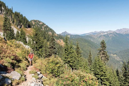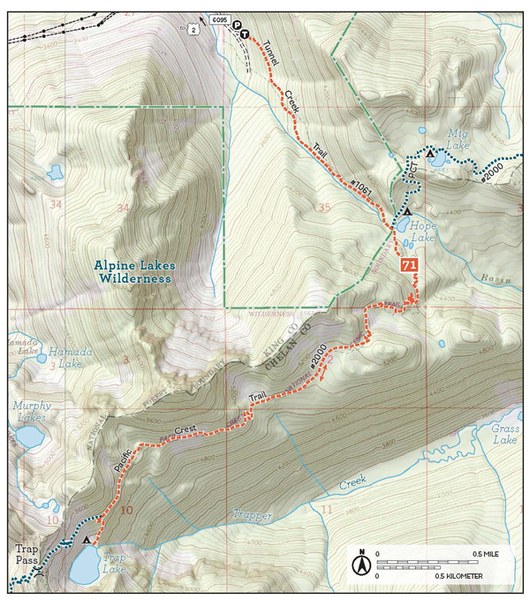 Depart from the trailhead, following the Tunnel Creek Trail #1061 as it wastes no time entering the forest and beginning a climbing traverse up the mountainside. The forest is heavy, thick with hemlock and drooping cedar. Push upward, ever upward, alternating between tight switchbacks and longer climbs. Navigate sections of narrow and rocky trail that cross over small streams and creeks, talus fields and avalanche chutes. Breaks in the canopy offer pocket views of the creek valley below. Enter the Alpine Lakes Wilderness just before arriving at Hope Lake at 1.4 miles at a junction with the Pacific Crest Trail #2000 (PCT). To the left, the PCT heads past Hope Lake and to Mig Lake (Hike 72), while Trap Lake lies to the right.