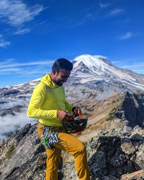 Ananth at the summit of Cowlitz Main Chimney, fall 2021.