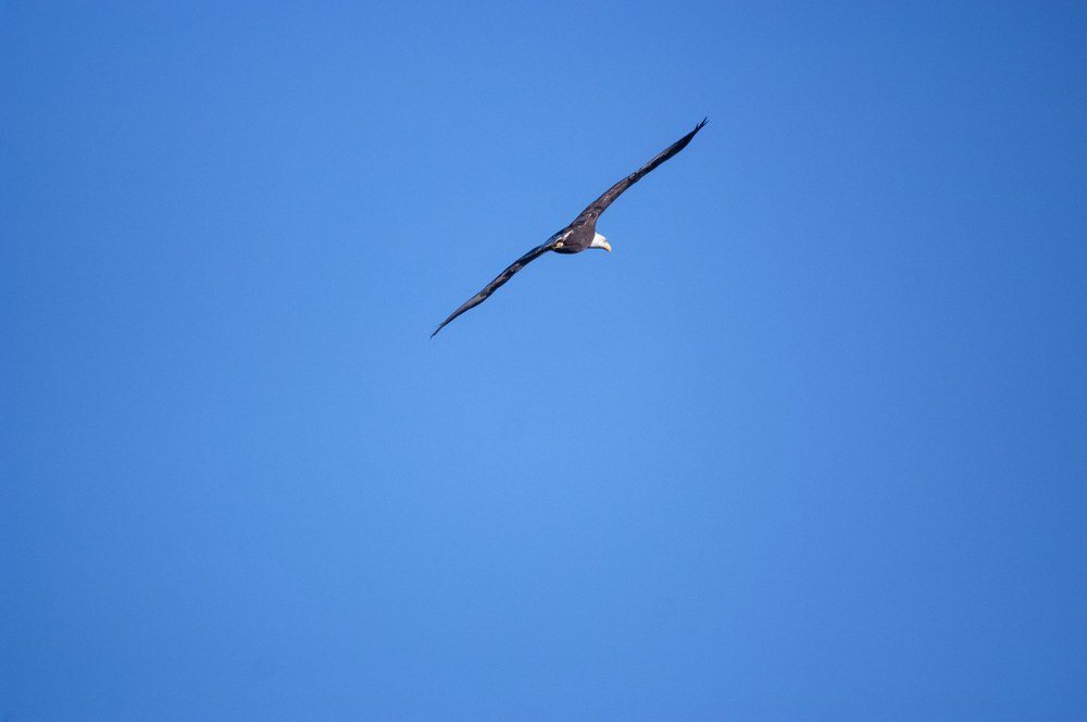A shadow darkens the window – a heartbeat of dim sunlight. I look up to see a large bird, a raptor, glide against the sky, wings stretched wide to catch a breeze. Squinting against the light, I catch the distinctive white head and tail before the eagle flicks a few feathers, banks right, and disappears. The train continues racing north to home while my gaze falls back to the shoreline looking for birds and animals, my little time with nature on my commute.