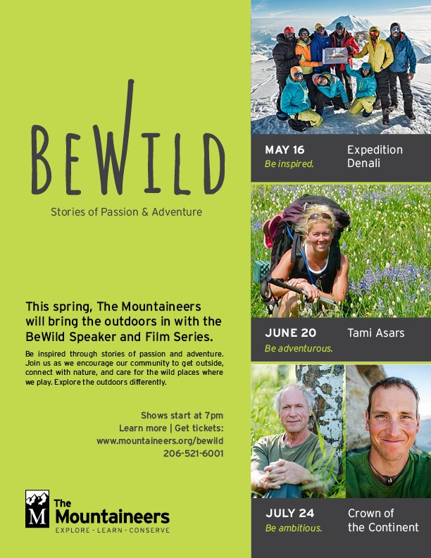 The Mountaineers invites you to join us this spring when we bring the outdoors in with the BeWild Speaker and Film Series. This series will inspire the everyday adventurer to explore, discover and conserve the wild spaces of the Pacific Northwest and beyond. Through stories of passion and adventure we will enable and encourage the community — especially the next generation — to get outside, seek adventure, connect with nature and be inspired to care for the wild places where we play. Join us as we explore the outdoors differently.