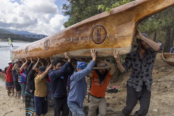 Out of respect, canoes are lifted and carried on shore rather than dragged. The Sinixt people are bringing this canoe ashore for a salmon-honoring ceremony at Sxwnitkw, which translates to “noisy fast water,” a reference to the rapids here before the river was flooded by the construction of the Grand Coulee Dam. Carved into the canoe are representations of ancient rock art from various places in Sinixt traditional territory. Photo by David Moskowitz.