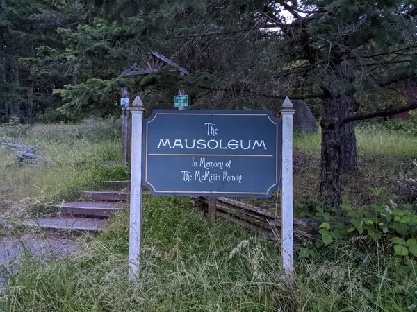 A sign for "The Mausoleum" reminding visitors that Afterglow Vista is a memorial for the McMillin Family.