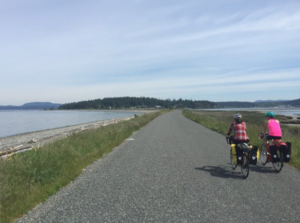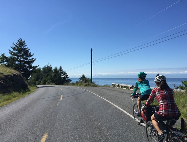 Cyclists on Bayshore Road enjoying 360-degree water views as they approach Fisherman Bay.