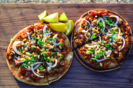 This recipe is inspired by my husband Daniel’s time living in Berlin, where he would pick up Turkish flatbread (lahmacun) most days for the equivalent of a couple bucks. As part of my research for this recipe, I reached out to my Turkish friend Rengin to get insider information. She shared that this dish is usually made in a large wood-fired oven with a thin layer of spiced meat baked right into the dough. The whole thing is typically topped with lots of fresh leafy greens, tomatoes, and raw red onions. For our campified plant-based version, we kept the rich spiced tomato base and went with shallots for a slightly milder allium. Our addition of tahini and pine nuts is totally nonregulation, but it has Rengin’s approval. — Mai-Ya