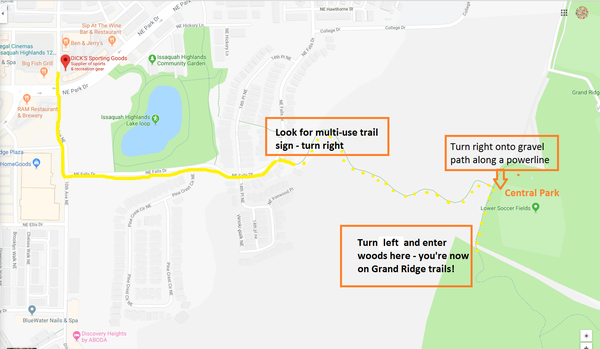 Take the Sound Transit Bus 554 to Issaquah Highlands, but get off at the stop at NE Ellis Drive, which is just before the Issaquah Highlands park and ride (it's okay if you end up at the park and ride, you'll just end up walking a little more). Head towards the Dick's Sporting Goods. Pass the store on NE Ellis Drive, turn left on 10th Avenue NE, then turn right on NE Falls Drive and walk uphill past a large pond on your left. Follow NE Falls Drive uphill and look for a multi-use trail sign on your right. Follow the path through a wooded area and you'll emerge just below Issaquah's Central Park. Above you can see the lights for the athletic fields. Ahead on your right beneath the power lines is a gravel path: turn right onto this path. Walk downhill and you can enter the Grand Ridge trail network - look for the sign on your left. Retrace your steps after wandering on these trails or extend your hike: Grand Ridge's trails connect to the Issaquah-Preston bike path, which connects back to Issaquah Highlands. Alternately, you can follow the Issaquah-Preston bike path down to the East Sunset Way trailhead and then follow East Sunset Way to the 554 bus stop near (water and a bathroom are available at the Issaquah public library close to this bus stop).