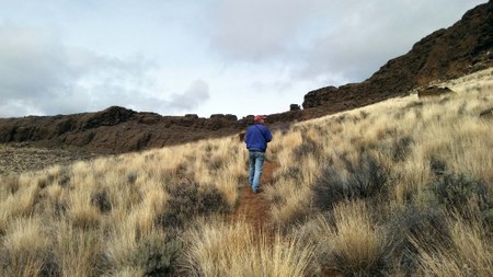 Standing atop Fort Rock, looking northwest across the valley as Mac McKay explores. Photo by Regina Robinson.