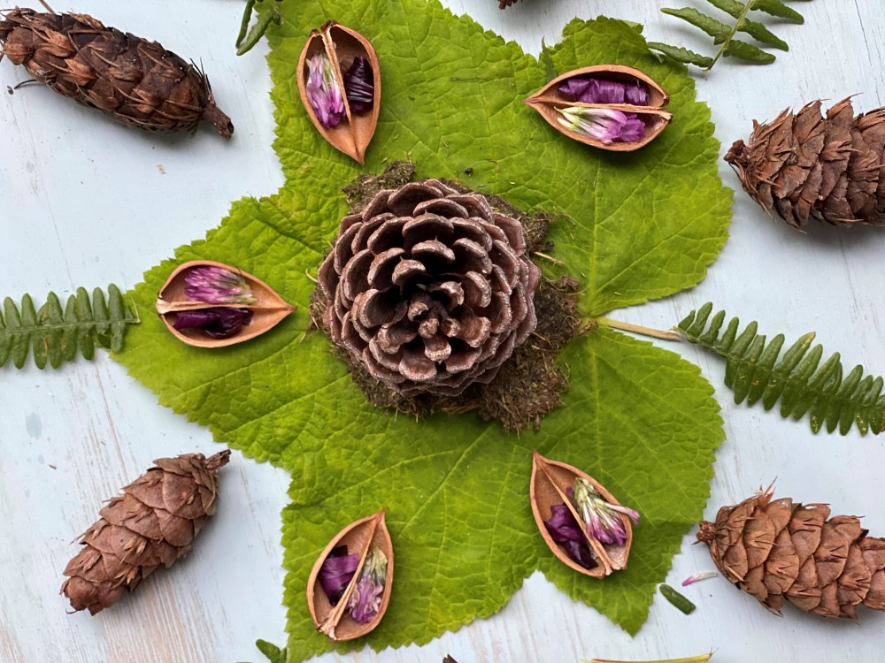 Izy, age 10 1/2, created this incredible natural masterpiece after gathering materials at a local park. We love the variety of petals inside the seed casings, as well as the overall symmetry of the piece! Thank you for sharing this with us Izy.