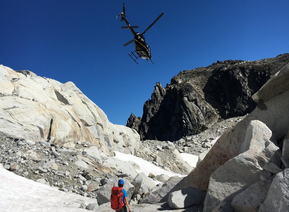 At 6:20am Chelan County Sheriff's helicopter flew to the location indicated by the beacons to take a look at us and motioned for us to stay put. So we did. About an hour later they dropped off volunteers from the Chelan County Mountain Rescue Association on flat terrain near the summit.