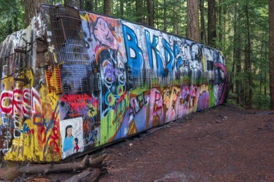 A short hike to take photos of seven box cars left over from a train wreck in 1956 that have since been painted with graffiti/art.
