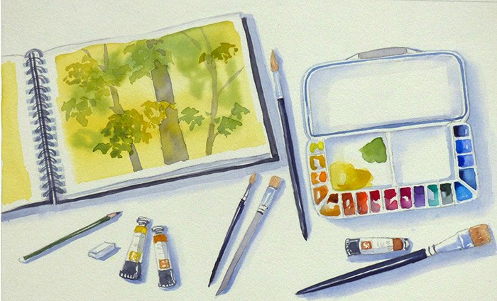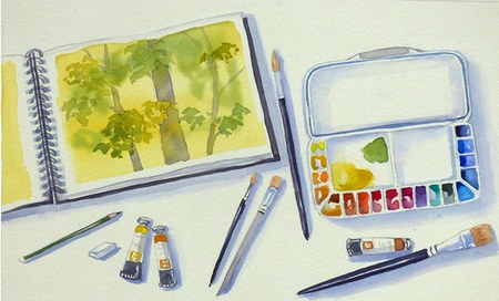 - A sketchbook is the foundational item. I love 10" x 13" hardcover, spiral-bound sketchbooks, which allow for every type of work and can be opened out in the field with no support other than your lap. The spiral binding allows you to do plein air drawing and painting on one page or on two facing pages for large, panoramic landscapes. I also appreciate the fact that I use only one size and type of sketchbook so there is a semblance of structure in my life and in my studio. I label them so I know where to find sketches, and they sit on a shelf together in chronological order, giving me a sense of accomplishment (however illusory!). Look for sketchbooks with 100 percent rag, 140 lb. cold press watercolor paper. I recommend rag paper because it is made of linen fibers, and is sized, which means it has been dipped twice in an animal by-product, a rich glaze that makes the paper stay wet longer and allows washes to literally slide on. Just compare how color glows on rag paper to how dull it looks on a non-sized wood pulp or cellulose paper and you will discover what I mean. On 100 percent rag paper, you can easily wipe out mistakes, although as pointed out above, some paints are staining and don’t wipe out quite as easily. Cold press, with a very slight texture, yields smoother washes, while hot press, with its satin finish is very good for pen and wash work but is more difficult for larger landscape watercolors. This rag paper is also sold in 22" x 30" sheets and in blocks -- 7" x 10" or 9" x 12" are good sizes and horizontal or square format blocks are interesting as well. You can also cut the large sheets of paper to your preferred dimensions and take it to a copy center to have it spiral bound for a very low cost. Beginners may find that smaller sketchbooks and paper sizes are more ideal.