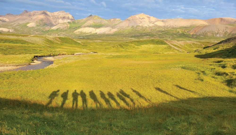 I particularly enjoyed the contrast between the verdant lowlands covered in grasses, lichens, and Arctic cotton, and the desolate uplands barren of greenery. My favorite snapshot from the trip is a photo of a vast grassy plain rising to a distant chain of mountains. In the foreground, you can see ghostly images midstep in the journey from strangers to friends.