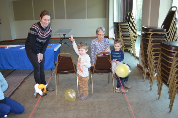 We decorated paper turkeys and perfected our tails in preparation for the balloon race. Attaching the tiny turkey to an untied (but full!) balloon, we released the balloons all at once, propelling the turkeys toward the finish line as the kiddos squealed in delight. (Learn more to try this activity at home with your family!)