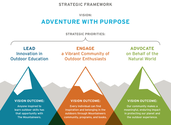 - ENGAGE a vibrant and inclusive outdoor community - so that every individual can find inspiration and belonging in the outdoors through Mountaineers community, programs, and books.